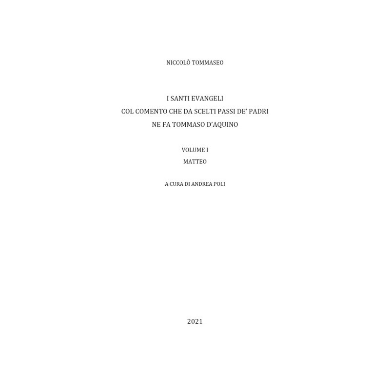 Il Vangelo di Matteo e i suoi commenti patristici raccolti da Tommaso d'Aquino, la Catena aurea, nella versione di Niccolò Tommaseo, sono un'opera che si distingue da un lato perché affronta questioni fondamentali, come la filologia testuale del Nuovo Testamento, l'interpretazione (il metodo dei quattro sensi, di cui si propone qui un'applicazione generale), la teoria della traduzione e la lingua letteraria; e dall'altro lato perché si serve - ed è pregio ineguagliato - dello stile proprio della storia di Cristo, il sermo humilis (E. Auerbach). L'analisi linguistica ha evidenziato infatti nella versione di Tommaseo una componente arcaica, soprattutto sintattica, corrispondente alla distanza cronologica dei Vangeli; e uno strato lessicale popolare e parlato (i cui elementi più significativi sono raccolti in un glossario), che svolge invece la funzione di indicare la contemporaneità del testo. Un tale linguaggio insieme concreto, semplice e solenne, genialmente messo al servizio dell'attualità dei Vangeli, contribuisce a fare di questa traduzione un classico della letteratura italiana. Il volume tratta anche della questione del testo e della traduzione della Bibbia fra il concilio di Trento e l'Ottocento.