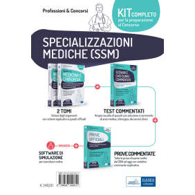 Kit per la preparazione alle prove di ammissione alle Scuole di Specializzazione mediche. Il pacchetto è composto da tre volumi: 1) Manuale di Medicina e Chirurgia (2 tomi - Isbn 9788836222124): sintesi degli argomenti con schemi esplicativi e quesiti ufficiali. 2) Scenari e casi clinici commentati (Isbn 9788836222377): ampia raccolta di quesiti con soluzione e commento di area medica, chirurgica e dei servizi clinici. 3) Prove ufficiali (Isbn 9788836222162): tutte le prove d'esame svolte dal 2014 ad oggi con sintetico commento esplicativo. In omaggio con l'acquisto del pacchetto di volumi software di simulazione per infinite esercitazioni.