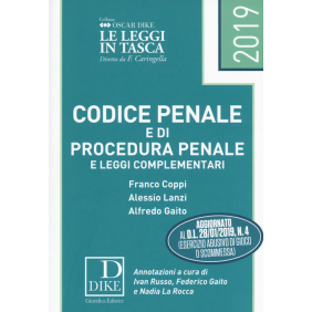 Il codice è: arricchito da utilissime e pregevoli note esplicative di diritto sostanziale e processuale; corredato dalle principali leggi complementari in tema di aborto, casellario giudiziale, collaboratori e testimoni di giustizia, depenalizzazione, equa riparazione, giudice di pace, giustizia minorile, mafia, ordine e sicurezza pubblica, mandato d'arresto europeo, ordinamento penitenziario, ordine europeo di indagine, reati bancari, reati della intermediazione finanziaria, reati fallimentari, reati societari, reati tributari, responsabilità delle persone giuridiche, stupefacenti. Aggiornato: D.L. 4 ottobre 2018, n. 113, convertito dalla L. 1 dicembre 2018, in tema di immigrazione e sicurezza; Legge di modifica dei reati contro la Pubblica Amministrazione.