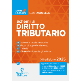 Gli "Schemi" guidano lo studente e il concorsista nello studio delle materie, aiutandolo a focalizzare l'attenzione sulle nozioni fondamentali e sugli aspetti principali di disciplina di ogni argomento, sulle analogie e le differenze tra gli istituti, sui profili meritevoli di approfondimento perché oggetto di attenzione da parte della dottrina e della giurisprudenza. I volumi sono caratterizzati dalla schematizzazione degli argomenti, che rende possibile una chiara e immediata comprensione e un'agevole memorizzazione, ed in particolare contengono: schemi e tavole sinottiche; tabelle di comparazione tra istituti; focus di approfondimento; particolari accorgimenti grafici, quali l'uso di simboli, elenchi puntati e grassetti, per sviluppare la memoria visiva. Tali elementi rendono i volumi una guida pratica per chi vuole prepararsi alla materia partendo dalle nozioni di base e dagli istituti fondamentali o per chi necessita di un ripasso veloce nell'imminenza della prova, fungendo anche da utile strumento da affiancare a manuali e compendi. Questa XII edizione del Volume è stata profondamente rivista e aggiornata in considerazione delle numerose novità normative intervenute, tra cui si segnalano: L. 30 dicembre2024, n. 207 (Legge di Bilancio per il 2025); D.Lgs. 13 dicembre2024,n. 192 (Revisione del regime impositivo dei redditi(IRPEF e IRES); D.Lgs. 14 novembre2024,n. 175 (Testo unico della giustizia tributaria). Numerosi gli spunti tratti dal più recente dibattito giurisprudenziale. Ad arricchire il Volume è inserito, in chiusura, un Glossario di parole giuridiche, in cui sono indicati istituti o principi non trascurabili nella preparazione, con la essenziale definizione.