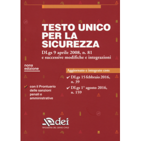Nona edizione del Testo Unico per la Sicurezza - allegati inclusi - DLgs 81/2008, integrato con tutte le successive modifiche, da ultimi: DLgs 15 febbraio 2016, n. 39, relativo alla classificazione, etichettatura ed imballaggio delle sostanze e delle miscele pericolose, DLgs 1 agosto2016,n.159 in attuazione della Direttiva 2013/35/UE sulle disposizioni minime di sicurezza e di salute relative all'esposizione dei lavoratori ai rischi derivanti dagli agenti fisici (campi elettromagnetici). Un dettagliato indice analitico-alfabetico consente di individuare le prescrizione relative agli articoli e relativi allegati mentre, in appendice, il prontuario delle sanzioni consente di renderle immediatamente rintracciabili evidenziandone la natura penale, amministrativa, pecuniaria, per le violazione degli obblighi a carico dei diversi Soggetti coinvolti.