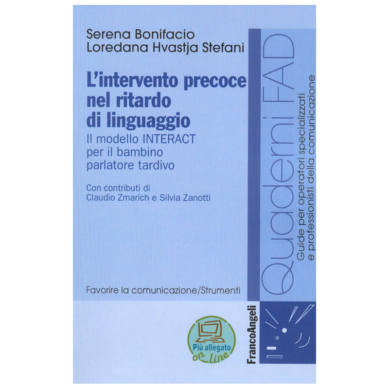 Il modello d'intervento INTERACT è un programma di prevenzione e intervento clinico studiato in maniera specifica per bambini tra i 24 e i 30 mesi di età che presentano un mancato sviluppo del linguaggio, oppure uno sviluppo lento non associato ad altri disturbi. Esso si attua all'interno della coppia genitore-bambino parlatore tardivo proponendo situazioni dinamiche che sollecitano la comunicazione attiva, e intende sostenere lo sviluppo comunicativo e linguistico del bambino nel suo percorso naturale. Il modello, unico in Italia, si avvale di un sistema dinamico di valutazione della coppia e di modalità operative pratiche quali le schede per genitori, che descrivono come praticare a casa quanto viene proposto o applicato nella seduta clinica. Il volume, rivolto in particolare a logopedisti, ma anche a neuropsichiatri, neurologi, pediatri e psicologi che operano in ambito clinico nella prevenzione del disturbo di linguaggio, comprende una parte teorica e di metodologia dell'intervento e una parte operativa scaricabile dal sito www.francoangeli.it.