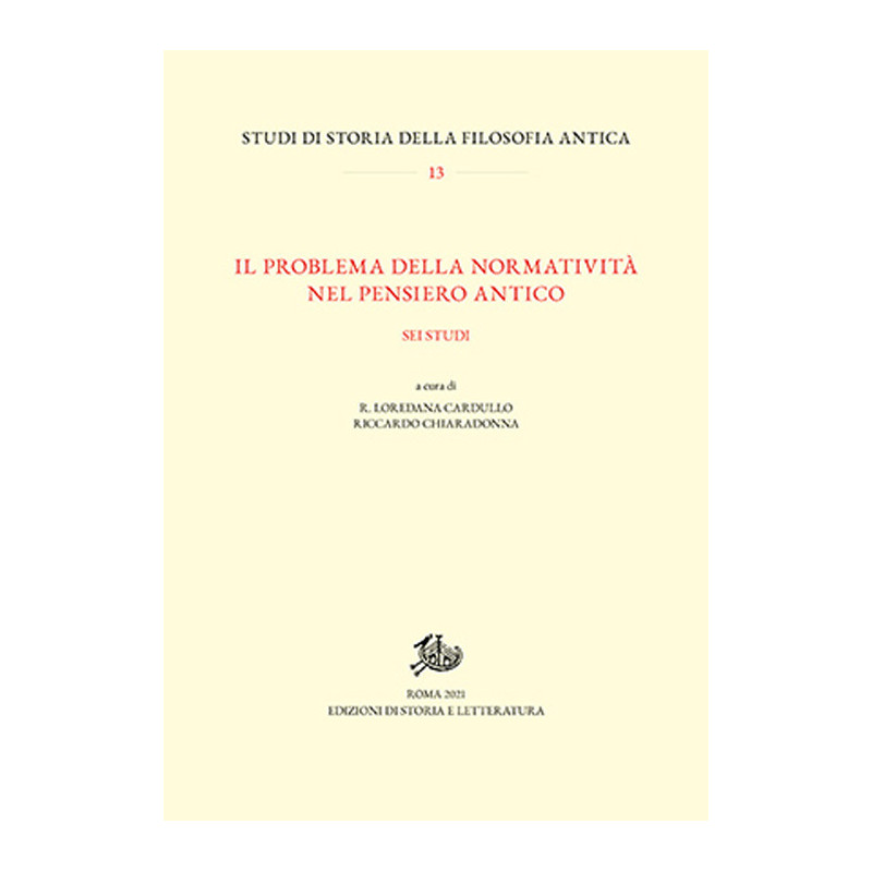 Il presente volume contiene in versione rivista e ampliata per la stampa le cinque relazioni che sono state presentate al Seminario annuale della Società Italiana di Storia della Filosofia Antica (SISFA), svoltosi a Genova nelle giornate del 24 e 25 gennaio 2020, con l'aggiunta di un sesto contributo, che ne completa e arricchisce il quadro. Il tema proposto dal Direttivo e accolto favorevolmente dall'assemblea dei soci nel corso del Seminario del 2019 è quello della norma o legge (nomos) nel pensiero antico. Si tratta dell'ottavo volume di Atti di questo importante appuntamento annuale della Società. Dopo aver dedicato l'incontro annuale a protagonisti o a scuole filosofiche, dai presocratici al Neoplatonismo, la Società ha rivolto la sua attenzione a temi che assumono una certa rilevanza nel pensiero filosofico antico, iniziando da logos e proseguendo con nomos, argomento del volume che qui presentiamo. I sei studi in esso contenuti affrontano il tema della normatività in autori dei secc. V e IV (dai pitagorici ad Aristotele), con la sola eccezione dell'ultimo saggio, che è dedicato alla lettura dello scetticismo da parte del filosofo novecentesco Giuseppe Rensi.