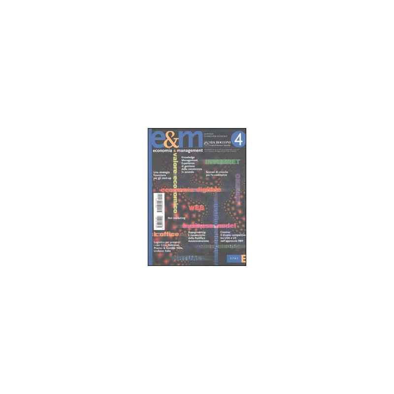 Si tratta del 4° numero del 2000 della rivista della Scuola di Direzione Aziendale Bocconi. Tra gli articoli di questo numero: Knowledge management (a cura di A. Biffi, P. Camussone); Il commercio elettronico: scenari per la crescita (S. Mariotti, F. Sgobbi); Net marketing. Ripensare il consumatore nel mondo della rete (S. Micelli, E. Prandelli); Logistica per processi nel settore dei beni di largo consumo. I casi di Cirio, Italaquae, Procter & Gamble Italia e Unilever Italia (M. Caputo, F. Michelino); Reengineering dei processi, strumento per l'innovazione della Pubblica Amministrazione (E. Ongaro); Il divario competitivo tra Stati Uniti e Unione Europea nel settore cinematografico (F. Perretti, G. Negro).