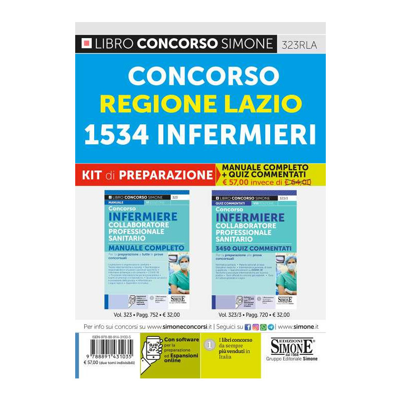 La regione Lazio ha deliberato un concorso aggregato per 1534. Infermieri Kit di preparazione comprende: "Concorso Infermiere Collaboratore professionale sanitario. Manuale completo per la preparazione a tutte le prove concorsuali" e "Concorso Infermiere Collaboratore professionale sanitario. 3450 Quiz commentati. Per la preparazione alle prove concorsuali".