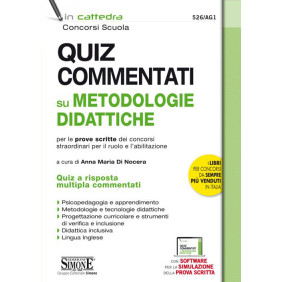 Nella Gazzetta ufficiale del 28 aprile 2020 sono stati pubblicati i bandi di concorso straordinario per il ruolo e l'abilitazione nella scuola secondaria di primo e secondo grado (decreti n. 510 e n. 497). La procedura concorsuale prevede, in entrambe le procedure concorsuali una prova scritta con sistema informatizzato con quiz a risposta multipla. La risposta esatta vale 1 punto, la risposta non data o errata vale 0 punti. La prova per l'accesso al ruolo e costituita da 80 quesiti a risposta chiusa con quattro opzioni di risposta cosìi ripartiti: competenze disciplinari relative alla classe di concorso: 45 quesiti; competenze didattico/metodologiche: 30 quesiti; capacita di lettura e comprensione del testo in lingua inglese: 5 quesiti. La prova del concorso straordinario per l'abilitazione prevede, invece, 60 quesiti: competenze disciplinari relative alla classe di concorso: 40 quesiti; competenze didattico/metodologiche: 20 quesiti. Per venire incontro alle esigenze di coloro che devono prepararsi a sostenere tali prove, questo testo propone una serie di quiz commentati su Metodologie e tecnologie didattiche e lingua inglese che consentono di testare la preparazione ed esercitarsi. Il libro e suddiviso in cinque parti aderenti al programma d'esame: psicopedagogia e apprendimento: psicologia dello sviluppo, psicologia dell'apprendimento scolastico e psicologia dell'educazione, competenze sociali; metodologie e tecnologie didattiche: principali metodi di insegnamento-apprendimento della scuola secondaria con particolare riguardo ai metodi attivi, cooperativi, laboratori ali anche attraverso l'impiego delle TIC; individualizzazione e personalizzazione dell'insegnamento-apprendimento; progettazione curriculare e strumenti di verifica e valutazione: principi e principali modelli della progettazione didattico-educativa; modalità di valutazione e di autovalutazione del processo di insegnamento e dei risultati di apprendimento; progettazione e sviluppo di attività di insegnamento finalizzate alla costruzione dei curricoli e delle programmazioni, disciplinari e interdisciplinari, a partire dalle Indicazioni Nazionali, dalle Linee guida e dai Quadri di riferimento per gli esami di Stato; didattica inclusiva: progettazione inclusiva; personalizzazione dell'apprendimento; tecnologie didattiche per l'educazione inclusiva; lingua inglese: schede grammaticali, questionario di comprensione del testo commentato, questionario non commentato. Completa l'opera un software con migliaia di quiz sulle Metodologie e tecnologie didattiche e Inglese che consente di esercitarsi e simulare la prova d'esame, ed esempi di quiz disciplinari delle principali classi di concorso.