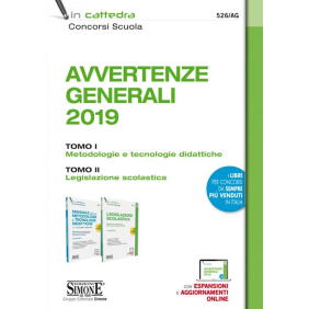Le Avvertenze generali richieste per la preparazione ai concorsi a cattedra, comprendono sia argomenti prettamente normativi (legislazione e normativa scolastica, ordinamenti didattici, valutazione e autovalutazione delle scuole, stato giuridico del docente ecc.) sia argomenti che concernono le conoscenze pedagogico-didattiche e le competenze relazionali che costituiscono il background fondamentale per ogni docente. Tutto il programma delle Avvertenze generali è trattato nei due Tomi di cui si compone questo manuale che copre sia la parte metodologico-didattica sia la parte normativa: il Tomo I - 526/B Metodologie e tecnologie didattiche (a cura di L. Gallo e I. Pepe) approfondisce gli aspetti metodologici che sono diventati parte fondamentale del processo di valutazione dell'aspirante docente; il Tomo II - 526/C Legislazione scolastica tratta tutti gli aspetti giuridici della professione, aggiornati alle numerose novità intervenute negli ultimi anni per effetto della L. 107/2015 e da ultimo alla Raccomandazione UE sulle competenze chiave 2018, alla legge di bilancio 2019 e alla nuova disciplina sull'esame di Stato (D.M. 37/2019). Approfondimenti e provvedimenti normativi di rilievo sono collocati nelle espansioni on line. Sempre tra le espansioni online saranno resi disponibili anche gli aggiornamenti normativi che dovessero intervenire fino alla data delle prove di concorso.