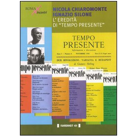 1956: nasce la rivista "Tempo Presente". Fondata e diretta da Chiaromonte e Silone, è stata una delle esperienze più interessanti, coraggiose, deliberatamente eretiche della cultura italiana del periodo. Il loro pensiero appare oggi attualissimo, nella tenace difesa della ragione democratica contro ogni forma di dittatura, di malafede o di autoritarismo. Interventi di: Federica Bellincata, Nicola De Cilia, Francesco De Core, Bruno Falcetto, Marcello Flores, Goffredo Fofi, Giancarlo Gaeta, Vittorio Giacopini, Gustaw Herling, Filippo La Porta, Michael Lswy, Marino Sinibaldi.