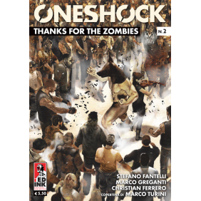 One Shock è la nuova collana di albi monografici di Inkiostro Edizioni. Caratteristica della serie è l'assenza di un protagonista principale, infatti ogni storia, autoconclusiva, tratta una vicenda che termina con l'albo, anche se non sono esclusi eventuali seguiti di episodi già pubblicati. In "Thanks For The Zombies" il contagio è una catastrofe che dà inizio a una guerra senza quartiere contro i morti viventi, ma allo stesso tempo è l'inaugurazione di una nuova epoca che può portare a un mondo rinnovato e libero. Un'avvincente storia di sopravvivenza che vede come sottofondo la più grande tragedia di rilevanza planetaria che si possa immaginare. I morti viventi divorano i vivi e i vivi finalmente possono essere loro stessi, liberi, senza le catene e le regole di una società che non esiste più e che probabilmente non tornerà mai ad esistere. Una dark comedy anarchica e splatterpunk, un fumetto dedicato a tutti gli amanti dell'horror estremo più bizzarro. Soggetto e sceneggiatura di Stefano Fantelli (The Cannibal Family, Splatter, La Iena) e Marco Greganti, disegni di Christian Ferrero (The Cannibal Family), copertina di Marco Turini (Marvel, DC Comics, IDW).
