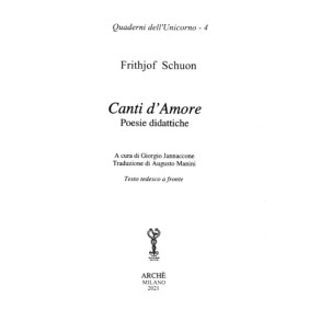 Traduzione di "Liebe" - che unitamente a Leben, Glück e Sinn forma una tetralogia edita da Verlag Herber, Freiburg im Breigau, 1997 - col titolo Canti d'Amore... Frithjof Schuon ... oltre a scrivere più di venti volumi che trattano di religione, filoso-fia, metafisica, spiritualità, e di altre considerazioni concernenti tutti gli aspetti della natura umana, ha composto anche moltissime poesie sia in tedesco, sua lingua madre, sia in francese e in inglese, che l'Autore soleva precisare "didattiche", ricche pertanto di insegnamenti morali e spirituali...