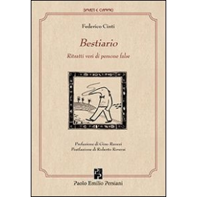 Dopo lo Speculum salutis (2009), rivisitazione a un tempo letterale e ironica del modello di Petrarca, Federico Cinti presenta ora il proprio Bestiario poetico e morale. Fedele alla forma prediletta del sonetto, l'autore torna a giocare con la tradizione letteraria che ripropone in chiave satirica ed eccentrica, accentuando la sua proverbiale vena epigrammatica. Le sculture zoomorfe e al contempo umanissime che compongono il suo duro Bestiario sono realizzate con l'intento di consegnare al lettore cognizioni e indicazioni sul presente contesto infame. Nei suoi ottanta "ritratti veri di persone false", Cinti dichiara di essersi attenuto ai "fatti" e ai "comportamenti" umani "più evidenti", come si trattasse di una descrizione pura e semplice, senza l'intervento giudicante dell'autore. Sembra quasi riecheggiare la voce di Ennio Flaiano, quando affermava che la realtà superava ormai ogni possibilità di satira. Molto incisive le illustrazioni disegnate per l'occasione dall'artista Davide De Lucia che rendono il testo ancora più gradevole alla lettura.