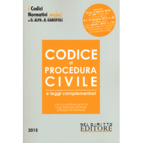 II codice di procedura civile è aggiornato ai più recenti e rilevanti interventi normativi, quali il D.Lgs. 6 agosto 2015, n. 130 - Attuazione della direttiva 2013/11/UE sulla risoluzione alternativa delle controversie dei consumatori, che modifica il regolamento CE n. 2006/2004 e la direttiva 2009/22/CE (direttiva sull'ADR per i consumatori); il D.L 27 giugno 2015, n. 83, coordinato con la legge di conversione 6 agosto 2015, n. 132 - Misure urgenti in materia fallimentare, civile e processuale civile e di organizzazione e funzionamento dell'amministrazione giudiziaria; il D.M. 7 maggio 2015 - Disposizioni applicative per l'attribuzione del credito d'imposta alle strutture ricettive turistico-alberghiere; la L. 6 maggio 2015, n. 55 - Disposizioni in materia di scioglimento e cessazione degli effetti civili del matrimonio nonché di comunione tra i coniugi; il D.Lgs. 4 marzo 2015, n. 23 - Disposizioni in materia di contratto di lavoro a tempo indeterminato a tutele crescenti; la L. 27 febbraio 2015, n. 18 - Disciplina della responsabilità civile dei magistrati.