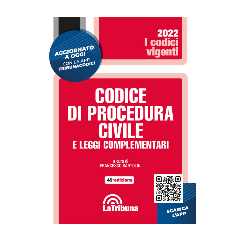 Quest'Opera fornisce ai lettori il testo aggiornato del Codice di procedura civile e delle principali leggi complementari. La selezione delle leggi complementari comprende materie fra le quali segnaliamo: Adozione; Arbitrato; Assegno e cambiale; Assicurazioni; Depenalizzazione; Equa riparazione; Esecuzione fiscale, Fallimento; Lavoro; Locazioni, Matrimonio; Mediazione; Negoziazione assistita; Notificazioni; Ordinamento giudiziario; Procedimento europeo di ingiunzione; Processo telematico; Responsabilità sanitaria; Semplificazione dei riti civili; Sezioni specializzate in materia di immigrazioni; Sovraindebitamento; Spese processuali; Tribunale delle imprese; Tribunale per i minorenni; Tutela dei consumatori e class action. La Tribuna offre ai lettori la possibilità di ricevere ogni giorno tutti gli aggiornamenti normativi che riguardano questo Codice. Dall'1 marzo sarà infatti attiva un'apposita App che permetterà di essere costantemente aggiornati. Nell'attesa dell'arrivo dell'App, tutti gli aggiornamenti quotidiani sono a disposizione sul sito LatribunaPlus.it