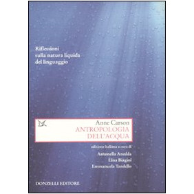 La voce più originale della letteratura in lingua inglese oggi, così Michael Ondaatje - l'autore del Paziente inglese - ha definito Anne Carson. A scorrere le pagine di questo piccolo capolavoro della celebratissima autrice canadese, non si fa certo fatica a comprendere le ragioni di una simile ammirazione: Anne Carson rompe qualsiasi schema e ha il dono raro di risvegliare nei suoi lettori energie emozionali e intellettuali assolutamente nuove. La lettura di questi testi non potrà che affascinare chi non crede nei "generi". Antropologia dell'acqua è infatti felicemente inclassificabile: possiede il ritmo della poesia e la concretezza della prosa, la logica della matematica e il respiro del pensiero. Saggi, diari, appunti di viaggio, racconti: i diversi materiali che compongono il volume sono in primo luogo una riflessione sulla natura liquida del linguaggio, sul suo stagnare, scorrere, dissolversi. Le pagine sono mappe su cui seguire la relazione tra le creature e l'acqua, tra l'amore e l'acqua, tra la morte e l'acqua. È un libro di viaggio che spalanca la descrizione per riflettere davvero sull'enigma del visibile, è una coraggiosa meditazione sul dissolvimento dei nostri legami e sulla nostra impotenza a trattenere chi amiamo, proprio come è impossibile trattenere l'acqua tra le dita. Un libro filosofico e poetico, tessuto, ma non appesantito, di citazioni, fitto di microracconti, a volte conclusi altre volte no, come accade del resto nella vita.