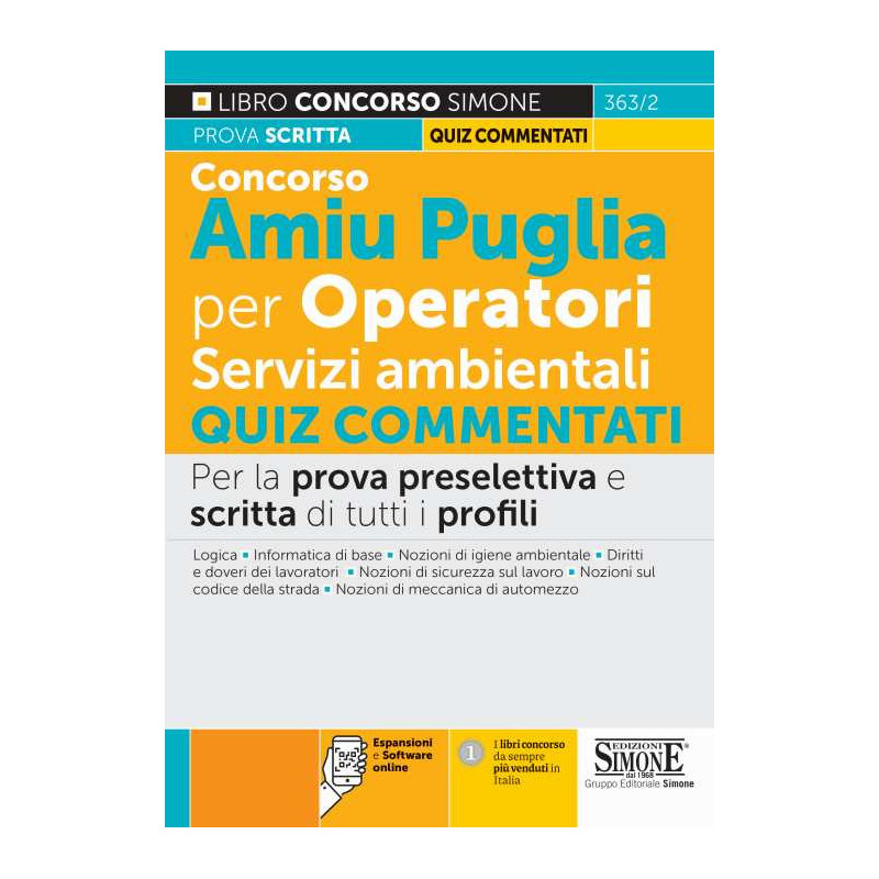 Il Manuale Concorso Amiu Puglia per Operatori Servizi ambientali â?" Quiz commentati è indirizzato alla preparazione dei candidati per lo svolgimento delle prove previste dagli avvisi di selezione pubblicati dallâ?(TM)Amiu Puglia S.p.A. il 3 dicembre 2021. Lâ?(TM)Azienda ha infatti avviato un vasto piano di reclutamento di personale pubblicando quattro diversi avvisi di selezione di Operatori di servizi ambientali sulle due sedi operative di Foggia e Bari. Le selezioni d Concorso Amiu Puglia prevedono lo svolgimento di una prova preselettiva, che verterà sulla logica e sullâ?(TM)informatica di base, e di una prova scritta con materie differenti per i due profili di: â?" Operatore ecologico professionale; â?" Operatore conduttore di automezzo. Il testo, pertanto, presenta numerosi questionari commentati ed è così suddiviso: â?" Questionario 1 â?" Logica; â?" Questionario 2 â?" Informatica di base; â?" Questionario 3 â?" Nozioni di igiene ambientale; â?" Questionario 4 â?" Diritti e doveri dei lavoratori; â?" Questionario 5 â?" Nozioni di sicurezza sul lavoro; â?" Questionario 6 â?" Nozioni sul Codice della strada; â?" Questionario 7 â?" Nozioni di meccanica di automezzo. Completa il manuale un utile software online con migliaia di quiz per infinite simulazioni della prova dâ?(TM)esame.