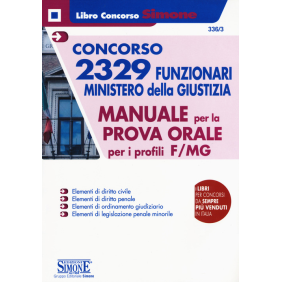 Con la G.U. 26 luglio 2019, n. 59 è stato bandito il concorso per 2329 Funzionari del Ministero della giustizia, di cui 2242 Funzionari giudiziari, 39 Funzionari amministrativi e 20 Funzionari dell'organizzazione, identificati con il codice F/MG. Superata la prova preselettiva e la successiva prova scritta, i candidati devono prepararsi per la prova orale che avrà ad oggetto oltre alle materie previste per la prova scritta (diritto amministrativo, diritto processuale civile, diritto processuale penale, ordinamento penitenziario) anche elementi di diritto civile, elementi di diritto penale, elementi di ordinamento giudiziario ed elementi di legislazione in materia penale minorile. Questo manuale, finalizzato alla preparazione della prova orale, riporta quindi la trattazione teorica delle seguenti materie: elementi di diritto civile; elementi di diritto penale; elementi di ordinamento giudiziario; elementi di legislazione penale minorile. Per completare la preparazione il testo va affiancato al Manuale della prova scritta (cod. 336/2) che contiene la trattazione delle altre materie richieste per la prova orale, già studiate per la prova scritta.
