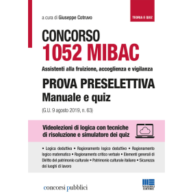 Il manuale è un utile strumento di preparazione per superare la prova preselettiva del concorso per 1052 assistenti alla fruizione, accoglienza e vigilanza del MIBAC (Ministero per i beni e le attività culturali) pubblicato sulla Gazzetta Ufficiale n. 63 del 9 agosto 2019 e gestito dalla Commissione RIPAM. La prova di preselezione prevista dal bando consiste in un test di 60 domande a risposta multipla, da risolvere in 60 minuti, per verificare la conoscenza delle capacità logico deduttive, del ragionamento logico matematico e ragionamento critico verbale, ma anche del grado di conoscenza di materie come diritto del patrimonio culturale, patrimonio culturale italiano e normativa sulla sicurezza dei luoghi di lavoro. Il volume si divide in 2 parti. La prima presenta una sezione manualistica, a cura di Giuseppe Cotruvo, seguita da batterie di quiz a risposta commentata su: Logica deduttiva; Problem solving; Ragionamento numerico; Ragionamento numerico deduttivo; Ragionamento critico numerico; Ragionamento critico verbale. Accanto a ogni tipologia di quiz è riportato il riferimento alla videolezione con cui poter approfondire l'argomento oggetto di domanda e imparare le tecniche di risoluzione per affrontare i quesiti. La seconda parte del volume contiene una parte teorica seguita da batterie di quiz su: Elementi generali di Diritto del patrimonio culturale; Patrimonio culturale italiano; Normativa sulla sicurezza dei luoghi di lavoro. Nella sezione online su https://www.maggiolieditore.it/approfondimenti, raggiungibile tramite il codice riportato in fondo al volume, sono disponibili le videolezioni del Metodo Cotruvo e il software di simulazione per esercitarsi e familiarizzare con la tipologia di prova a quiz.