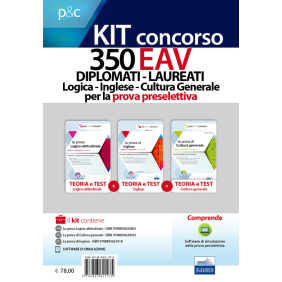 Kit per la preparazione alla prova preselettiva del concorso per 350 posti diplomati-laureati (vari profili) presso l'EAV. Il kit è composto da tre volumi: "La prova logico-attitudinale": teoria e test con soluzioni commentate di logica verbale, ragionamento critico, logica numerica, ragionamento astratto; "La prova di cultura generale": teoria e test con soluzioni commentate di grammatica, letteratura, storia, educazione civica, geografia, matematica, scienze, inglese, informatica, attualità; "La prova di inglese": teoria e test con soluzioni commentate, completo di esercizi di reading comprehension ed esercitazioni di listening con brani audio mp3.