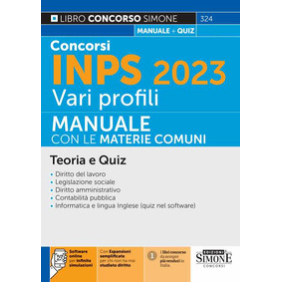 Il manuale Concorsi INPS 2023 con le materie comuni è diretto a coloro che intendono iniziare la preparazione per il concorso che si prevede possano essere bandito dall' INPS nel 2023. (consulta il nostro blog concorsi) Il libro, sulla base dei programmi previsti nei precedenti concorsi per i diversi profili cercati dall'INPS, contiene la trattazione teorica delle materie comuni: Diritto del lavoro; Legislazione sociale; Diritto amministrativo; Contabilità pubblica; Informatica e lingua inglese (quiz nel software). Il manuale Concorsi INPS, inoltre, è corredato da numerose risorse online: espansioni semplificate per chi non ha mai studiato il diritto, espansioni di approfondimento e un software, grazie al quale è possibile esercitarsi, con infinite simulazioni, in vista delle prove d'esame. Tutti i testi per i concorsi INPS.