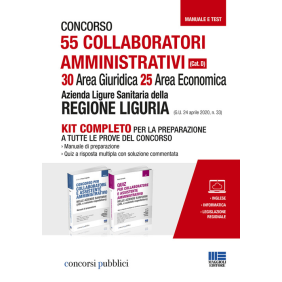 Sulla Gazzetta Ufficiale del 24 aprile 2020 n. 33 sono stati pubblicati 2 bandi di concorso per 55 collaboratori amministrativi, cat. D (30 per l'area giuridica e 25 per l'area economica), indetti dall'Azienda Ligure Sanitaria della Regione Liguria. Il bando prevede le seguenti prove: prova preselettiva (in caso di alto numero di candidature); test a risposta multipla.