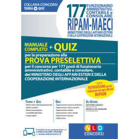 Il Ministero degli affari esteri e della cooperazione internazionale, in data 17 luglio 2018, ha indetto un Concorso pubblico, per titoli ed esami, per la copertura di 177 posti di funzionario amministrativo, contabile e consolare. Lo svolgimento del concorso prevede le seguenti fasi: prova preselettiva; prove scritte; prova orale. La prova preselettiva, della durata di cinquanta minuti, consiste in settanta domande a risposta multipla, di cui una sola giusta, sulle seguenti materie, ivi inclusi i quesiti per l'accertamento della capacità di logicità del ragionamento: diritto civile e internazionale privato; diritto consolare; diritto amministrativo; contabilità dello Stato; lingua inglese. Il presente volume costituisce uno strumento essenziale per la preparazione alla prova preselettiva del Concorso e contiene un'ampia selezione di quiz delle suddette materie, in relazione ai quesiti per l'accertamento della capacità di logicità del ragionamento, sono stati attentamente selezionati quiz delle seguenti tipologie: ragionamento numerico deduttivo; ragionamento critico numerico; ragionamento verbale; ragionamento critico verbale; ragionamento astratto; abilità visiva. Il Manuale permette l'accesso gratuito al simulatore on line con il quale è possibile esercitarsi con batterie di domande a risposta multipla consultabile con apposita password presente nel retro del volume.