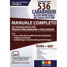 In data 27 febbraio 2018, il Ministero della Difesa ha indetto un concorso pubblico, per titoli ed esami, per l'ammissione all'8° corso triennale (2018-2021) di 536 allievi marescialli del ruolo Ispettori dell'Arma dei Carabinieri. Lo svolgimento del concorso prevede l'effettuazione di: prova preliminare; prove di efficienza fisica; accertamenti psico-fisici per la verifica dell'idoneità psico-fisica; prova scritta per accertare il grado di conoscenza della lingua italiana; accertamenti attitudinali; prova orale; prova facoltativa di lingua straniera. La prova preliminare, in particolare, della durata di 60 minuti consisterà nella somministrazione di un questionario comprendente quesiti a risposta multipla su argomenti di cultura generale, di storia dell'Arma dei Carabinieri, di logica deduttiva, di informatica e inglese. Il presente volume costituisce un valido strumento per la preparazione alla prova preliminare del Concorso. Per ciascuna materia, vengono trattate in maniera chiara e esaustiva le nozioni teoriche essenziali, in modo tale da fornire al candidato la possibilità di apprendere rapidamente i concetti e di ripassare velocemente i contenuti oggetto di studio. La parte teorica è corredata dalle mappe concettuali, che aiutano a focalizzare l'attenzione sugli aspetti principali delle materie previste dal bando e dalla parte relativa all'accertamento attitudinale e al colloquio, con l'indicazione dei principali test psicologici. Di particolare interesse la parte compendiale dedicata alla disciplina "Storia dell'Arma dei Carabinieri", prevista dal bando di concorso. Le discipline trattate sono: storia dell'Arma dei Carabinieri, italiano (letteratura + lingua italiana), storia, geografia, matematica, educazione civica, scienze, informatica, lingua inglese, deduzioni logiche, attualità (nella estensione online). Il volume si conclude con le simulazioni della prova d'esame, costituite da batterie di domande a risposta multipla che prevedono quattro opzioni di soluzione fra le quali viene indicata la risposta corretta, utili per esercitarsi nell'imminenza della prova e per imparare a gestire bene i tempi. Completa poi la tua preparazione l'innovativo simulatore online, con il quale è possibile esercitarsi con batterie di domande a risposta multipla, aventi a oggetto le materie del volume, e i quiz di attualità consultabili con apposita password presente nel retro del volume.