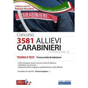 Il volume è indirizzato a quanti intendono partecipare al concorso per 3581 Allievi Carabinieri indetto dal Ministero della Difesa (G.U. 25 febbraio 2020, n. 16), aperto anche ai civili. Il testo è articolato in parti. Nella prima parte, fornisce indicazioni sulla storia dell'Arma, sulla figura professionale del Carabiniere e sulle prove che ciascun concorrente dovrà affrontare partecipando al concorso. Nella seconda parte, il volume sviluppa il programma d'esame previsto dal bando per la prova scritta di selezione, che consiste nella risoluzione di quesiti a risposta multipla su argomenti di cultura generale (italiano, attualità, storia, geografia, matematica, Costituzione e cittadinanza italiana, scienze), storia e struttura ordinativa dell'Arma, comprensione di un testo scritto e logica deduttiva (ragionamento numerico e capacità verbale), informatica (conoscenze delle apparecchiature e delle applicazioni informatiche più diffuse), lingua straniera. Nella terza parte, il volume fornisce tre esercitazioni che permettono di esercitarsi in vista della prova scritta di selezione.