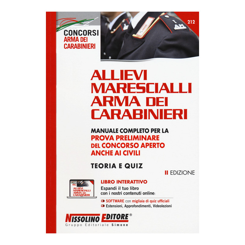 Il volume, giunto alla II edizione, si propone come utile strumento di preparazione alla prova preliminare dei concorsi aperti anche ai civili per il reclutamento di Allievi Marescialli nell'Arma dei Carabinieri. Il testo, perfettamente conforme a tutte le materie del programma d'esame, si struttura in teoria e quiz, offrendo al candidato la possibilità sia di prepararsi su ciascuna disciplina, sia di esercitarsi con appositi test di verifica e, soprattutto, mediante un software con migliaia di quiz ufficiali per infinite simulazioni della prova d'esame. Questi gli argomenti trattati: Grammatica e Capacità verbale; Comprensione di un testo scritto; Letteratura italiana; Matematica, Geometria, Ragionamento numerico; Informatica; Geografia; Scienze; Inglese; Storia; Cittadinanza e Costituzione; Storia e struttura ordinativa dell'Arma dei Carabinieri; Attualità. L'opera, integrata da una breve Introduzione sulla storia e l'ordinamento dell'Arma dei Carabinieri, è arricchita da ulteriori sussidi interattivi gratuiti (espansioni online, videolezioni) che rendono lo studio piacevole e dinamico.