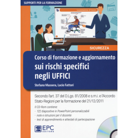 Corso di formazione e aggiornamento sui rischi specifici negli uffici secondo l'art. 37 del d.lgs. 81/2008 e s.m.i. e l'Accordo Stato-Regioni per la formazione del 21/12/2011. Il d.lgs. 81/08 attribuisce fondamentale importanza alla formazione nella gestione dell'igiene e della sicurezza sul lavoro. L'Accordo della Conferenza Stato-Regioni 222/ESR del 21/12/11 e le successive modifiche e integrazioni hanno dettagliato i percorsi formativi dedicati alla figura del lavoratore, dei dirigenti e dei preposti. Nelle disposizioni che regolano la formazione è più volte ribadito che questa deve essere deve essere "specifica": disegnata quindi sul singolo ciclo produttivo e sulla realtà aziendale oggetto di intervento. Questo prodotto risponde all'esigenza di differenziare i percorsi didattici e contiene il materiale per un corso di formazione o aggiornamento per lavoratori del comparto uffici secondo le indicazioni dell'art. 37 del d.lgs. 81/08. Il percorso proposto contiene 2 moduli per complessive 4 o 6 ore dedicati agli aspetti normativi ma, soprattutto, ai vari fattori di rischio riscontrabili in questi ambienti per un totale di oltre 120 slide commentate. Il materiale proposto può essere facilmente adattato alle specifiche esigenze aziendali e incrementato al mutare delle condizioni e delle normative di riferimento. Al testo è allegato un cd-rom nel quale sono fornite le diapositive in formato PowerPoint, oltre ai questionari di valutazione e ai modelli degli attestati di formazione.