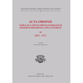 Questo volume riproduce il manoscritto, AG 2 dell'Archivio Generale dei Cappuccini che contiene gli Acta Ordinis, relativi alla celebrazione di 8 capitoli generali, dal 1625, al 1667. Tali capitoli, normalmente della durata di circa un mese e con la partecipazione di circa 140 padri capitolari, erano fondamentalmente di carattere elettivo, ma in essi venivano discussi e risolti anche i problemi che man mano emergevano nella vita dell'Ordine, venivano chiariti i dubbi riguardanti l'osservanza della regola e delle costituzioni e in genere venivano trattati i vari aspetti della vita dei frati all'interno e all'esterno delle mura conventuali. In questi anni, dal 1625 al 1667, l'Ordine cappuccino sperimentò una crescita costante, passando dai16.967 frati in 1.192 conventi ai 24.764 frati viventi nei 1.509 conventi. Ciò comportava la nascita di nuove province, con problemi legati alla divisione dei conventi e dei frati, ai nuovi ambiti di espansione e all'adattamento ai nuovi paesi.