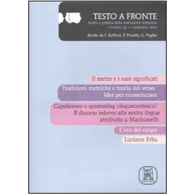 "Testo a fronte" è una pubblicazione semestrale di teoria e pratica della traduzione letteraria diretta da Franco Buffoni, Allen Mandelbaum, Emilio Mattioli. La rivista, che propone articoli, riflessioni, brevi saggi di traduzione, recensioni e segnalazioni, affianca ai grandi nomi sia in ambito saggistico sia in ambito creativo, i nomi di giovani studiosi e poeti.